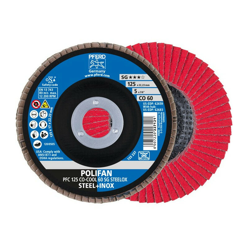 Grana ceramica CO con rivestimento refrigerante attivo per l'affilatura (COOL) - la grana ceramica autoaffilante garantisce risultati di lavoro ottimali su materiali difficili da lavorare come acciai altamente legati e resistenti alla ruggine, leghe a base di nichel e titanio - per la rettifica di superfici, la lavorazione dei cordoni di saldatura, la smussatura e la sbavatura di acciaio inossidabile (INOX), acciaio, pelle laminata, leghe a base di nichel e leghe di alluminio (dure) - foro 22,23 mm Ø Altre caratteristiche tecniche: - Alesaggio: 22,23 mm - Velocità massima: 12200min-¹