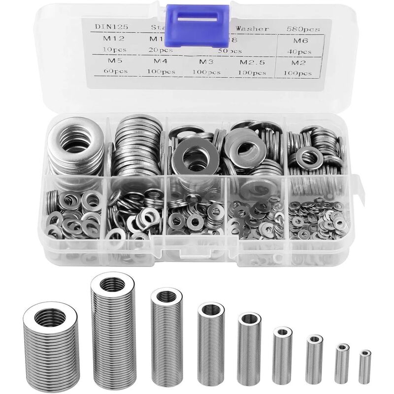 Rondelle in metallo di tutte le dimensioni -- Ci sono un totale di 580 pezzi di rondelle piatte in acciaio inossidabile 304 con scatola di plastica. 9 taglie: M2, M2.5, M3, M4, M5, M6, M8, M10, M12, ideali sia per professionisti che per dilettanti. Materiale di alta qualità: queste rondelle sono realizzate di acciaio inossidabile di alta qualità, hanno una resistenza alla ruggine superiore e un'eccellente resistenza all'ossidazione, che possono garantire un uso prolungato. rondelle assortite per la casa e il negozio. Ampia applicazione: adatta per la decorazione di interni, la costruzione di esterni, la manutenzione elettrica e la riparazione di mobili. Ideale per collegamenti elettrici su elettrodomestici e elettrodomestici commerciali, automobilistici e marittimi in cui la fonte di alimentazione ha una connessione di tipo filettato/a bullone. Facile da installare: queste rondelle in acciaio inossidabile sono facili per installare e garantire un aspetto pulito e attraente per il tuo