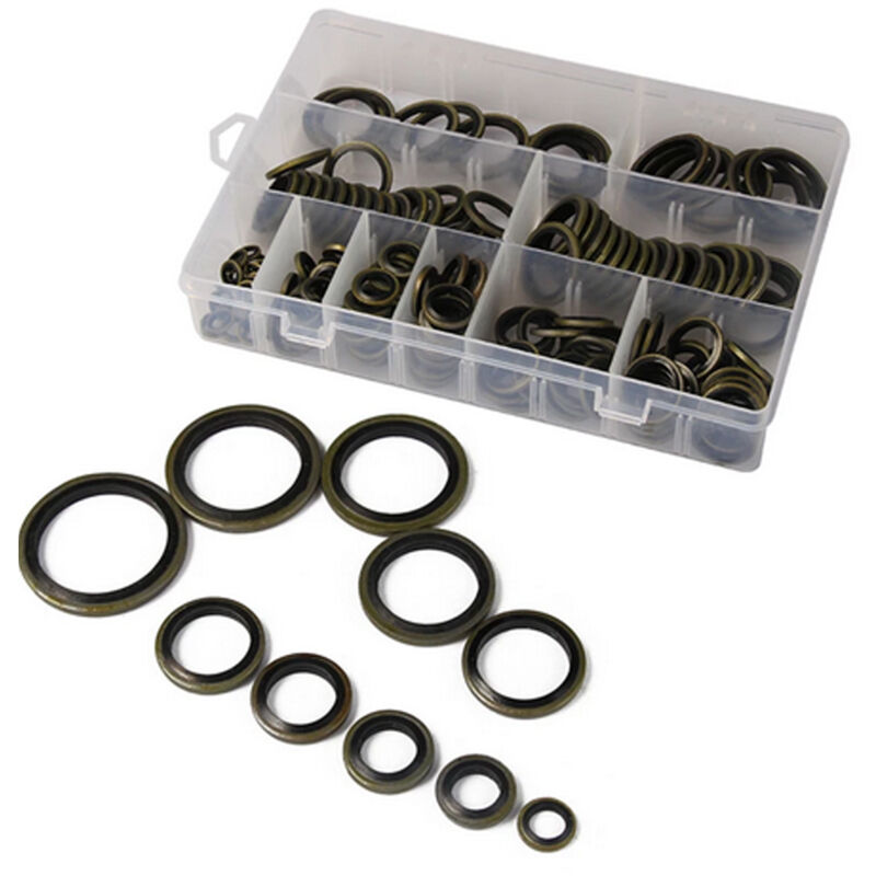 Kit Rondelle Piatte 165 pezzi Anelli di Guarnizione Metallo Gomma Distanziatori Set composto da 165 guarnizioni. Il tutto viene venduto in un comodo box in plastica. Utile kit assortito di guarnizioni tipo O-RING METRICHE, da ben 10 tagli differenti, ideali per tutti quei tipi di settori in cui questi gommini possono risultare molto utili per riparazioni e messe a punto. Il tutto fornito in una comoda valigetta in plastica. Caratteristiche tecniche: Guarnizioni piatte in gomma e metallo Stile contemporaneo Misure: 20 pcs di M6 15 pcs di M8 10 pcs di M10 20 pcs di M12 20 pcs di M14 20 pcs di M16 20 pcs di M18 20 pcs d M20 10 pcs di M22 10 pcs di M24 Materiale: Gomma e metallo Peso: 0.442 gr circa La confezione contiene: Nr. 1 kit di rondelle da 165 pz