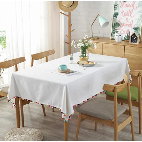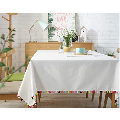 RONGER Tovaglia in Nappa Bianca Pura Nordica Elegante Decorazione in Cotone E Lino Palline di Pelo Colorate Tovaglia Rettangolare Party Hotel Antipolvere (White,140 * 220CM)