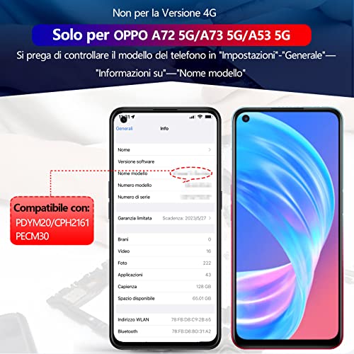 Lo schermo del display è per OPPO A72 5G PDYM20/A73 5G CPH2161/A53 5G PECM30(Non per la versione 4G). Assicurarsi che il modello del telefono prima dell'acquisto. Assicurati che il modello del tuo telefono prima dell'acquisto.