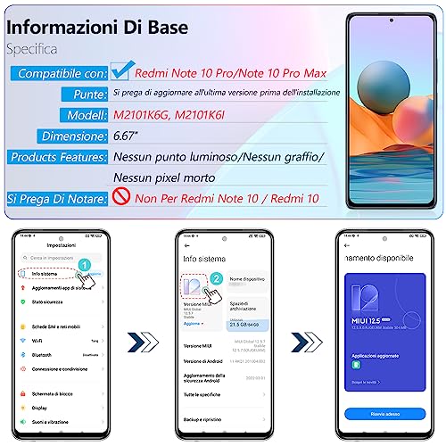 Lo schermo del display è per 6.67" Xiaomi Redmi Note 10 Pro M2101K6G M2101K6R/Redmi Note 10 Pro Max M2101K6I(Non per Redmi Note 10/Redmi 10) .Assicurarsi che il modello del telefono prima dell'acquisto.