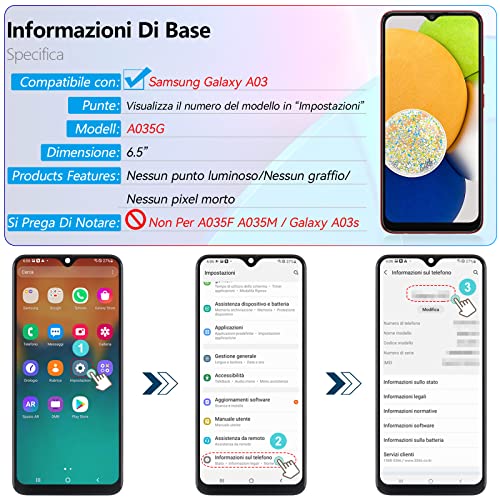 Compatibilità - Display LCD per 6.5" Samsung Galaxy A03 A035G Ricambio(Non per A035F A035M/Galaxy A03S).. Assicurati che il modello del tuo telefono prima dell'acquisto.