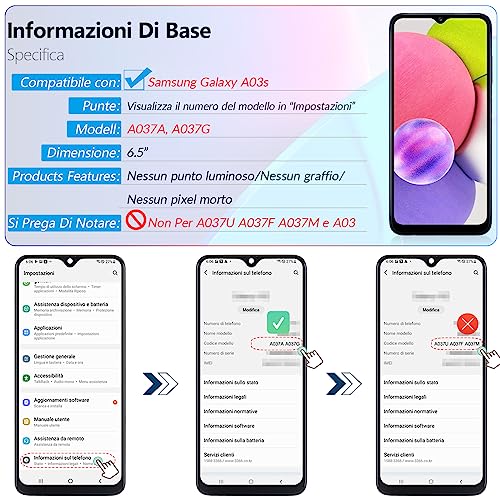 Lo schermo del display è per 162 mm Samsung Galaxy A03s A037A A037G(Non per A037U A037F A037M e A03).Assicurarsi che il modello del telefono prima dell'acquisto.