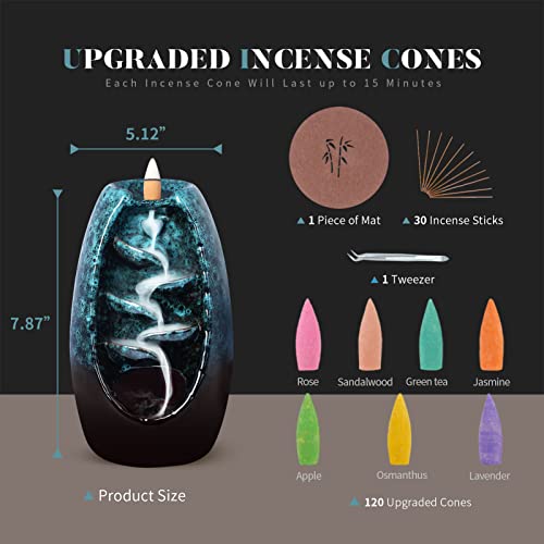 Ronlap Bruciatore di incenso a riflusso, in ceramica a cascata con 120 coni di incenso aggiornati+30 bastoncini di incenso+1 pinzetta, per aromaterapia meditazione decorazioni domestiche, blu