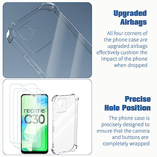 Ronvweay Custodia per telefono cellulare trasparente compatibile per Realme c30 c30s, con 3 pellicole protettive per lo schermo in vetro temperato, resistente agli urti e ai graffi.