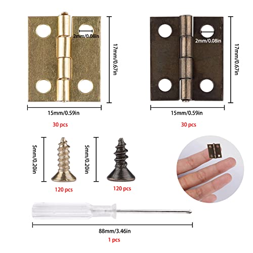 ※【A tua scelta】: Forniamo 30 pezzi ciascuno Piccole cerniere in ottone e Mini Cerniere in Bronzo,120 pezzi ciascuno viti in oro e bronzo,due colori,soddisfa le tue diverse esigenze,dotato anche di un cacciavite,più comodo per l'installazione mini cerniere per casa delle bambole.