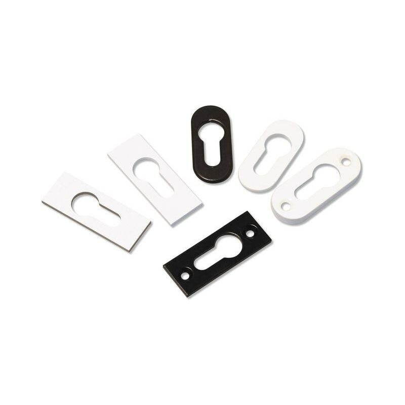 Dettagli: Rosone adesivo = 60 x 25 mm, spessore 3 e 5 mm, autoadesivo Disponibile anche in versione cieca Rosone da avvitare = 66 x 26 mm, interasse 50 mm, spessore 3 mm Fissaggio a vista.