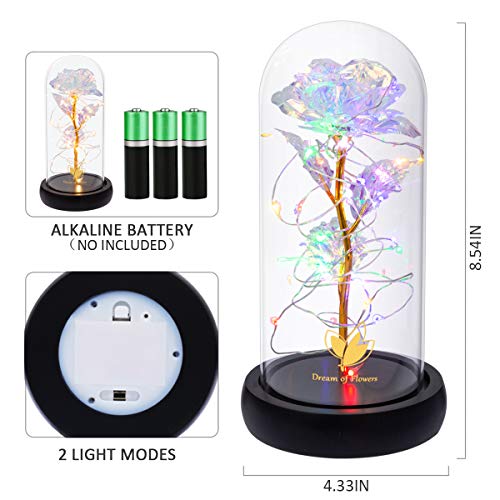 La rosa nella cupola di vetro è avvolta attorno alla striscia di luce LED, alimentata da 3 alimentatori AA (non inclusi) e la luce a LED ha una luce bianca calda brillante. La luce a LED a forma di rosa può essere utilizzata come decorazione della stanza o crea un'atmosfera romantica di giorno e di notte. La rosa di vetro LED simboleggia apprezzamento, benedizione, amore eterno, passione e romanticismo.