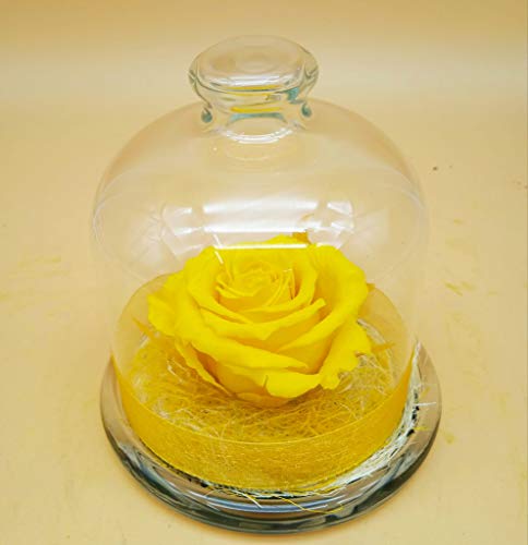 Rosa eterna Giallo. Spedizione Premiun. Mini Campana in Vetro, Altezza 15 cm, con Rosa eterna di 6 cm di Diametro, su Foglie di Rosa preservate e Nido in sisal.