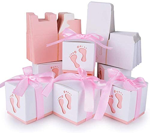 50 PZ Rosa Orma Scatoline Portaconfetti Battesimo per Ragazzo, Scatoline Nascita con Impronta Carina e Nastri Eleganti, 6X6X6cm Scatole Bomboniere per Battesimo, Nascita, Baby Shower