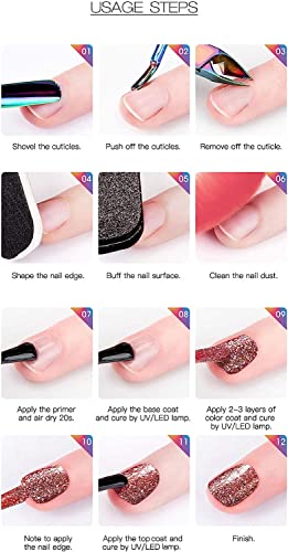 Applicazione: applicazione di 2 o 3 strati per ottenere il colore pieno. È necessario applicare la base e il top coat e polimerizzare sotto la lampada dell'essiccatore UV / LED.