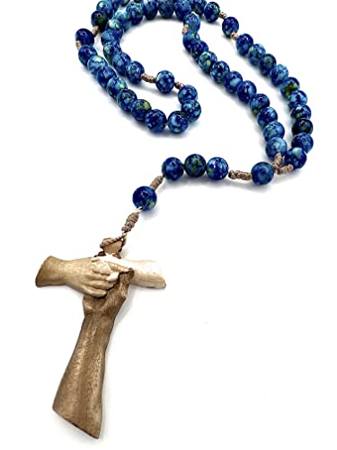 Rosario dell'amicizia in vetro marmorizzato blu e croce in legno. Grani mm. 8. Prodotto italiano. (1 PEZZO)