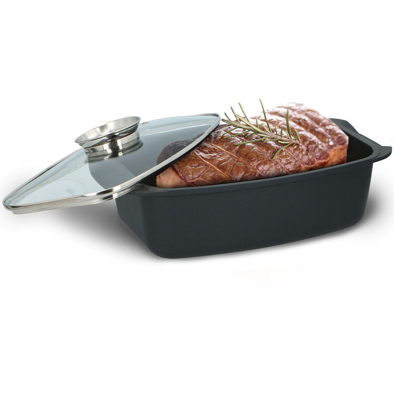 Padella robusta per un aroma pienoCottura da soli arrosti, involtini di manzo e verdure stufate? Con la padella in alluminio pressofuso con coperchio in vetro riuscirete i veri classici della cucina come la nonna. Il professionista per arrostire e stufare garantisce un aroma completo e risultati di cottura succosi. Il set da 2 pezzi è composto da teglie con coperchio in vetro abbinato.Un arrosto succoso richiede tempo. La casseruola in alluminio massiccio pressofuso funge da ritenzione ottimale del calore durante la cottura e rende possibile una cottura delicata e a risparmio energetico nonostante i lunghi tempi di cottura.Per la festa l'arrosto risulta anche più grande? Lo spazio di cottura 34 x 20,5 x 9,5 cm offre ampio spazio per arrosti, anatre e simili.Non importa se a gas, elettrico, la teglia è adatta a tutti i piani cottura, tranne quelli a induzione. Dopo la frittura, puoi anche preparare il tuo arrosto comodamente nel forno.Il pulsante aromatizzante integrato garantisce