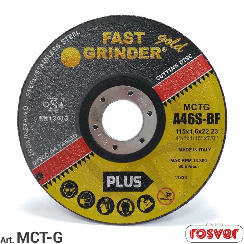 Dischi Taglio Industriali Rosver MCT-GOLD D.230 - Conf.25pz Nuova generazione di dischi da taglio - linea industriale, da usare con minismerigliatrici angolari. Minor materiale da asportare durante il taglio con conseguenti vantaggi: taglio più veloce e preciso, minor sviluppo di calore e rumore etc, assenza di bave. MISURA FORO A36S A46S 230x2,0 22 3,17
