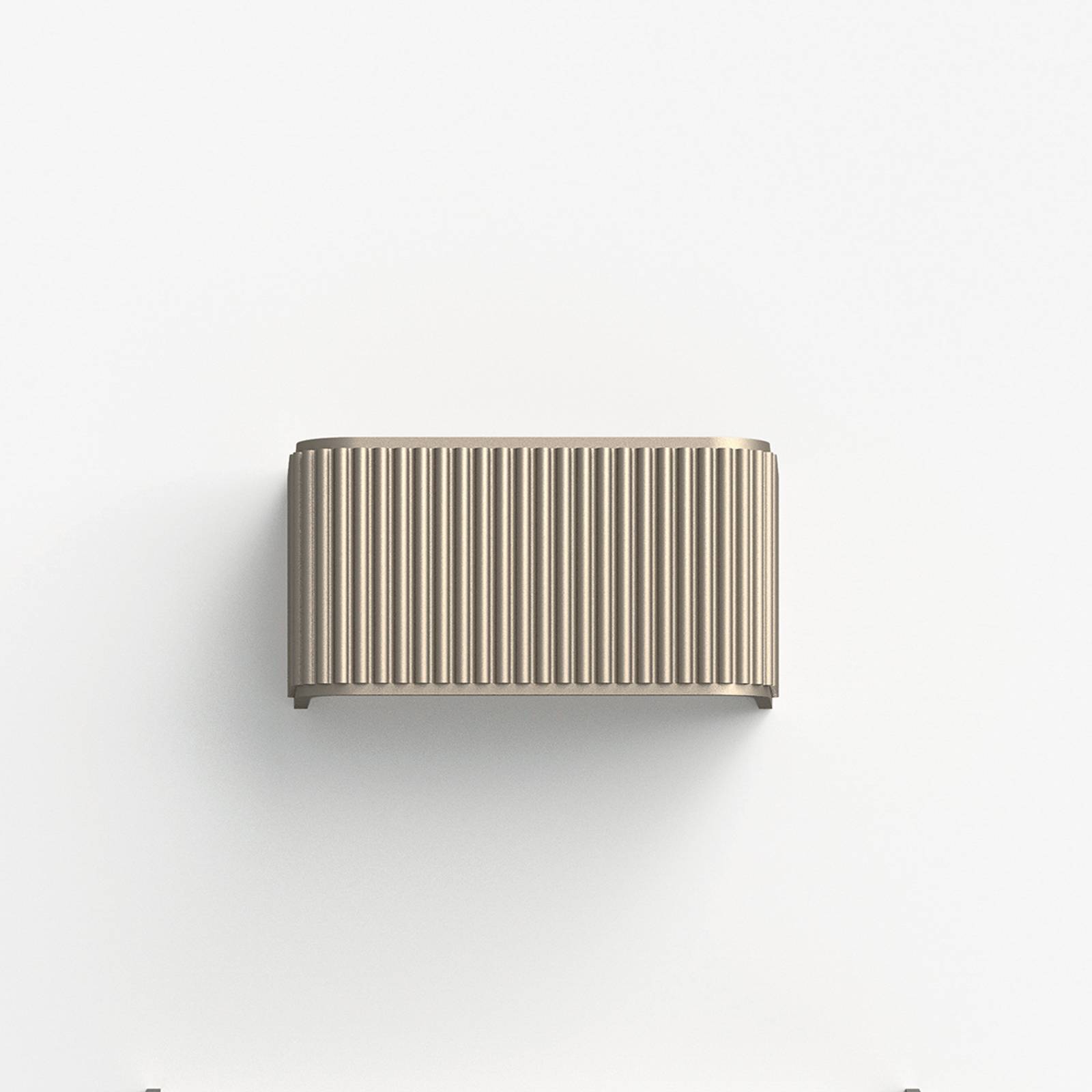La lampada da parete Dresscode LED creata dal designer Giovanni Lauda nel 2019 è dotata di un paralume in alluminio estruso che sembra non essere in metallo ma in tessuto plissettato e perline. Sono installati LED di colore bianco caldo, che emettono la loro luce morbida indirettamente verso l'alto e direttamente verso il basso. prodotto in Italia da Rotaliana