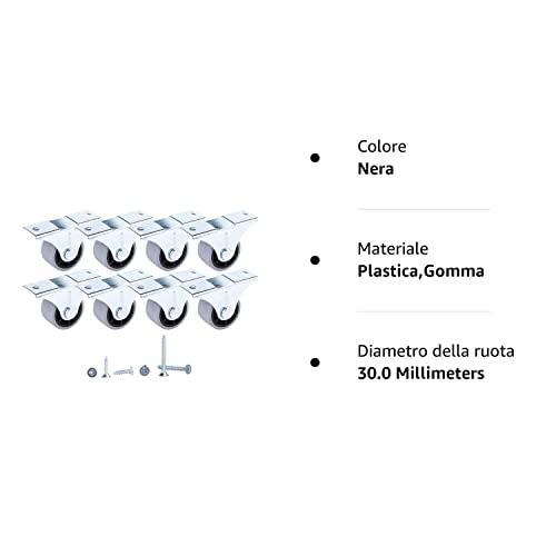 ✔️ Confezione: 8 ruote + 16 viti piccole (4,0 x 16 mm) + 16 viti più grandi (4,0 x 30 mm). È possibile utilizzare quelli più corti (16 mm di lunghezza) se la base di montaggio non è spessa, ad esempio su un pannello per mobili. Sia quelli più corti che più lunghi sono inclusi nel set insieme alle ruote;