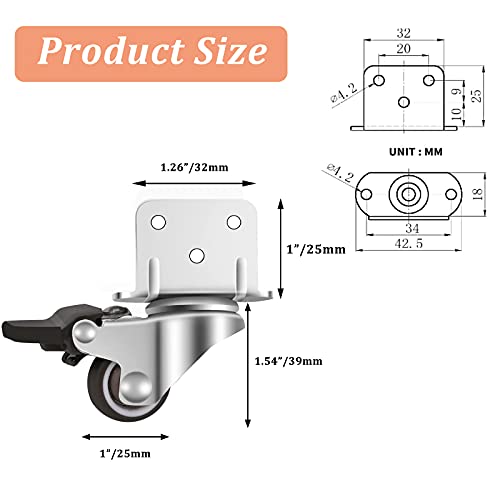 Set di 4 Rotelle per Mobile, 25 mm Ruote Girevoli con Piastra di Montaggio a L, Ruote in Gomma Pesanti con Cuscinetti per culle e mobili, supporto per fiori, Carico Massimo 44kg (2 standard+2 freni)