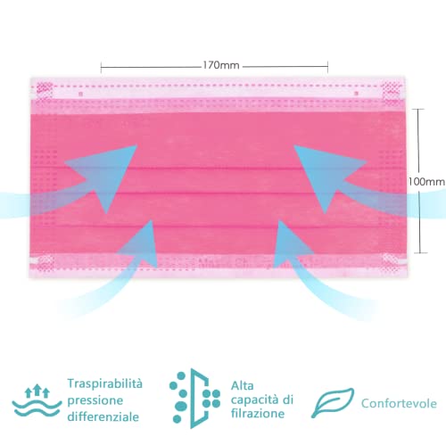 CAPACITÀ FILTRANTE: Le mascherine chirurgiche colorate adulti sono prodotte a tre strati, per garantire un eccellente filtrazione. Ogni strato è in polipropilene (tessuto non tessuto, TNT) con differente spessore e densità per avere il massimo comfort e respirabilità durante l'utilizzo.