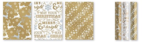 3 x 5M Rotoli Di Regalo Di Natale Carta Pacchi Oro & Crema Renna Fiocco di neve