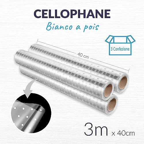 Cellophane di qualità Niente più fogli di cellophane trasparente che si strappa o che non è robusto abbastanza per gli imballaggi. Il nostro rotolo di carta regalo trasparente con motivo a punti bianchi è pensato per proteggere i tuoi regali senza alcun danno al materiale. Il cellophane è avvolto in un rotolo trasparente per confezioni per evitare eventuali strappi ma è facilissimo da srotolare e utilizzare.