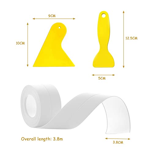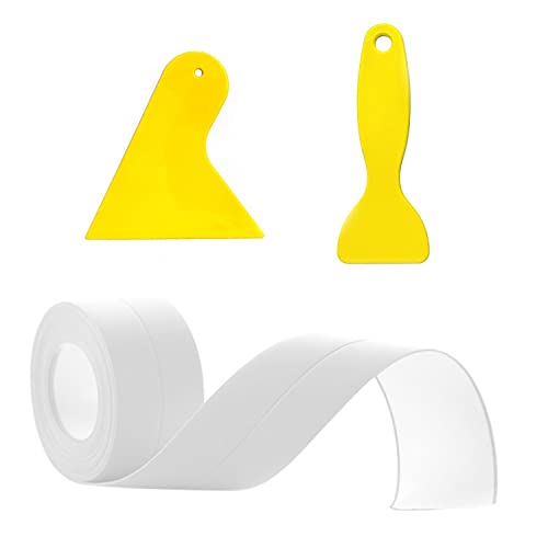 1 rotolo di striscia per calafataggio (38 mm * 3,2 m) e 2 raschietti, nastro sigillante bianco autoadesivo impermeabile, adatto per cucina, bagno, pavimento, con strumento sigillante