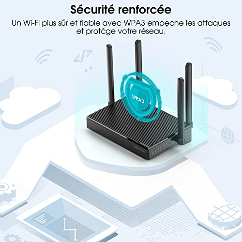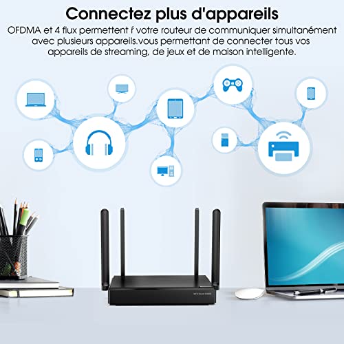 Router Wi-Fi 6 ad alta velocità: il router AX1800 è dotato della tecnologia IEEE802.11 AX, che consente di aumentare notevolmente la velocità e la capacità complessiva. Il peut fournir une vitesse WiFi jusqu'à 1,8 Gbps (bande 5 GHz 1201 Mbps, bande 2,4 G 573,5 Mbps).Il convient parfaitement au streaming vidéo 4K, aux jeux en ligne, au téléchargement et à une navigation plus rapide.