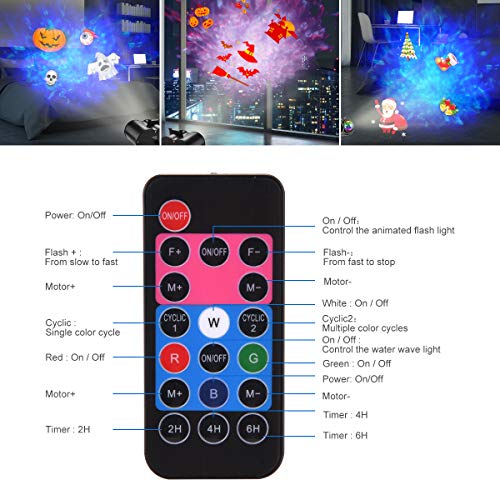 【2 in 1 Gemelli Proiettore Natale Esterno】 Die proiettore luci natalizie è dotato di due teste di proiezione, una per l'effetto ondulazione dell'onda d'acqua RGBW e un'altra per la proiezione del modello. L'ultimo, variegato, diverso modello colorato scivola con diverso effetto onda dell'oceano colorato per Halloween e Natale.
