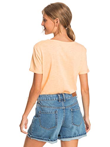 Maglietta da donna. Le caratteristiche del prodotto sono: jersey fiammato in cotone e poliestere [180 g/m2], taglio regolare, classico e confortevole, scollo rotondo, fondo arrotondato, maniche arrotolate, punto incrociato dorato in Lurex sulle maniche e stampa