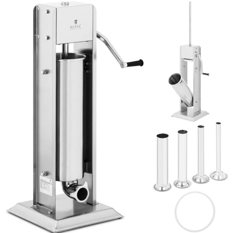 Prepara salumi facilmente con l'insaccatrice verticale di marca Royal Catering ✅ Modello: RCWV-7L ✅ Articolo: 10010865 ⬇️ Caratteristiche principali Efficace: trasmissione della forza ottimale grazie alla manovella ergonomica. Versatile: quattro diversi tubi di riempimento per differenti tipi di salsicce. Universale: costruzione modulare che permette a destrimani e mancini di utilizzare l'insaccatrice. Spaziosa: grande cilindro con 14 cm di diametro e 7 l di contenuto. Facile da pulire: acciaio inox duraturo, adatto al contatto con gli alimenti e semplice da pulire. ⬇️ Dettagli tecnici Materiale Acciaio inox Diametro del cilindro [mm] 140 Manuale Sì Pedale No Controllo della velocita Sì Tubi di riempimento 4 Pc Altezza del cilindro 440 mm Capacita del cilindro 7 l ⬇️ Descrizione del prodotto Con questa insaccatrice manuale RCWV-7L di Royal Catering puoi preparare salsicce polacche, wurstel e mortadella. Grazie ai quattro tubi di riempimento inclusi nella spedizione puoi produrre