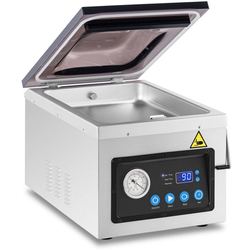 Air, assaggia - con il tuo dispositivo a vuoto professionale Con il dispositivo a vuoto per la ristorazione reale, saldare cibo in breve tempo ermetico e gocciolare in sacchetti di lamina. Di conseguenza, le merci rimangono fresche più lunghe e protette contro polvere e sporcizia. In ristoranti, hotel o catering, il dispositivo compatto con alloggiamento in acciaio inossidabile è adatto a tutte le aziende che proteggono gli ingredienti in modo sicuro, conservano in modo pulito o si preparano per la cottura Sous-Video. Per inciso, il dispositivo a vuoto viene utilizzato anche nell'industria farmaceutica ed elettronica per proteggere farmaci, sostanze chimiche e componenti elettronici sensibili dall'umidità e altri fattori che influenzano la qualità e l'efficacia dei prodotti. Sigillatura grazie a 1000 W sacchi a vuoto con 5 blocco della cucitura di saldatura a larga saldatura a larga saldatura - a prova di efficiente ed economico - Il dispositivo funziona con una velocità del vuoto di