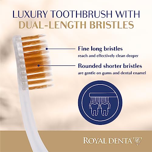 Royal Denta Spazzolino da denti con setole morbide dorate, confezione da 4, spazzola morbida per denti sensibili, spazzolino a doppia lunghezza per pulizia interdentale, particelle dorate per