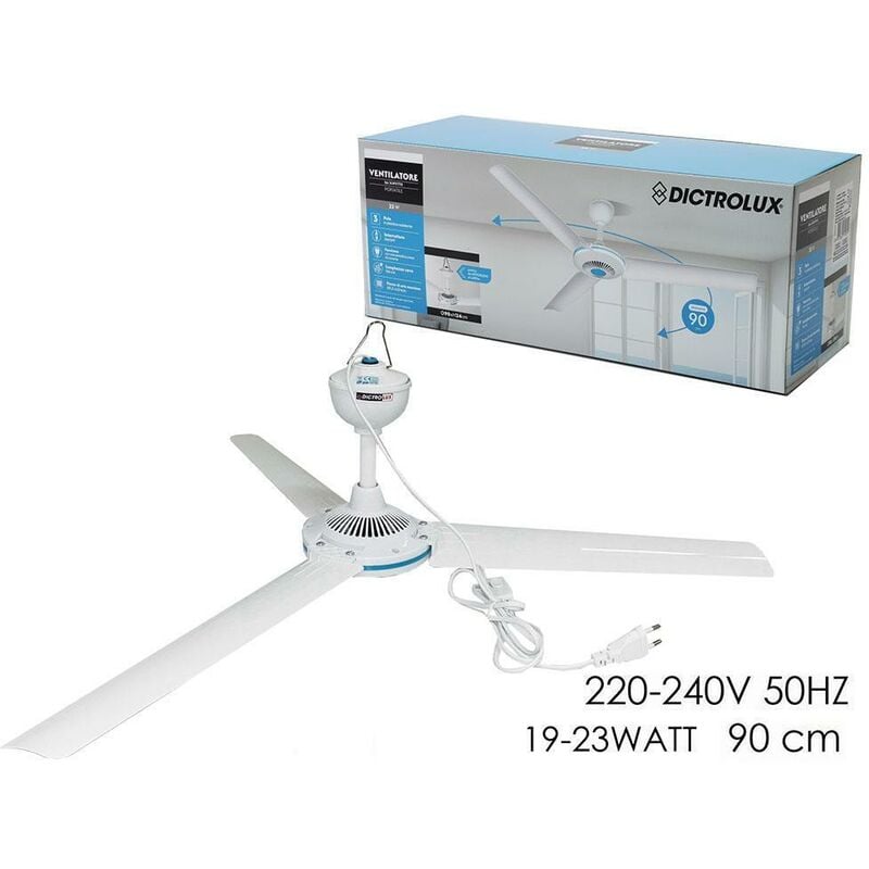 Ventilatore a pale da soffitto portatileFunziona con una semplice presa di corrente, pratico e silenzioso facile da smontare e pratico da portare comodamente in ogni stanzaDiametro massimo 90cm3 pale resistentiLunghezza cavo 150 cmInterruttore ON/OFF su cavoGancio per appenderlo al soffittoDimensioni h24cm x ø90cmAlimentazione 220-240V~50Hz - Potenza 23 watt
