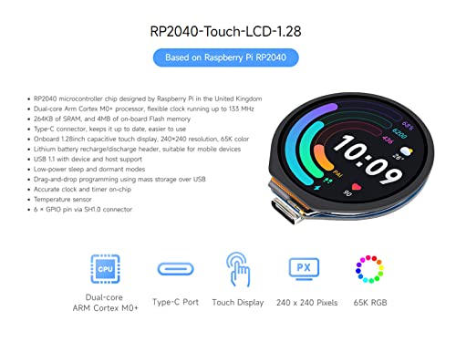RP2040 microcontroller development board onboard 1.28inch capacitive touch display, 240×240 resolution, 65K RGB color ips screen