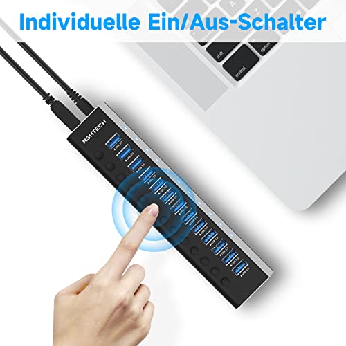 RSHTECH Hub USB 3.0 Alimentato, Hub USB 3.0 in Alluminio con Alimentazione da 72W (12V/6A), Hub USB a 13 Porte con Cavo Dati da 100 cm per la Ricarica e il Trasferimento Dati, RSH-A13-5
