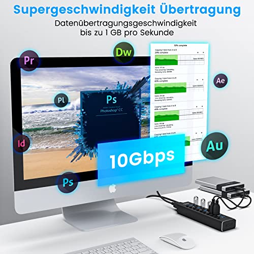 RSHTECH Hub USB Attivo 3.0 con Alimentatore 10Gbps 10 Porte USB 3.1 in Alluminio Hub con 2 Cavi (Cavo Tipo C e Tipo A), Interruttori di LED e Adattatore di Alimentazione 36W(12V/3A), RSH-A10S