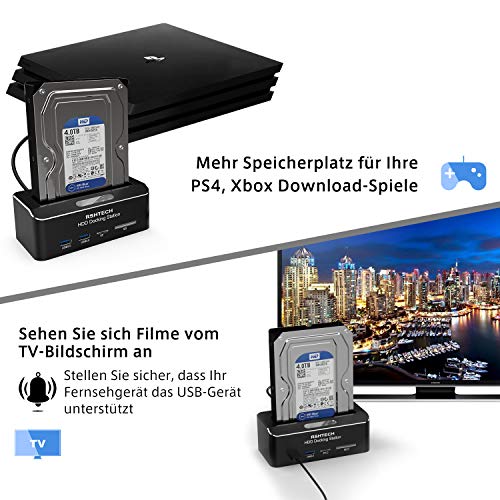 Ampia compatibilità: RSHTECH HDD e SSD Docking station compatibile con Windows 2003 / XP / Vista / Win 7 / Win 8 / Win 10, Mac OS, Linux 9 e superiore, PS4, PS4 Pro, Xbox 360, Xbox One, Nintendo Switch, e retrocompatibile con USB 2.0 / 1.1. La docking station supporta solo SATA HDD e SSD.