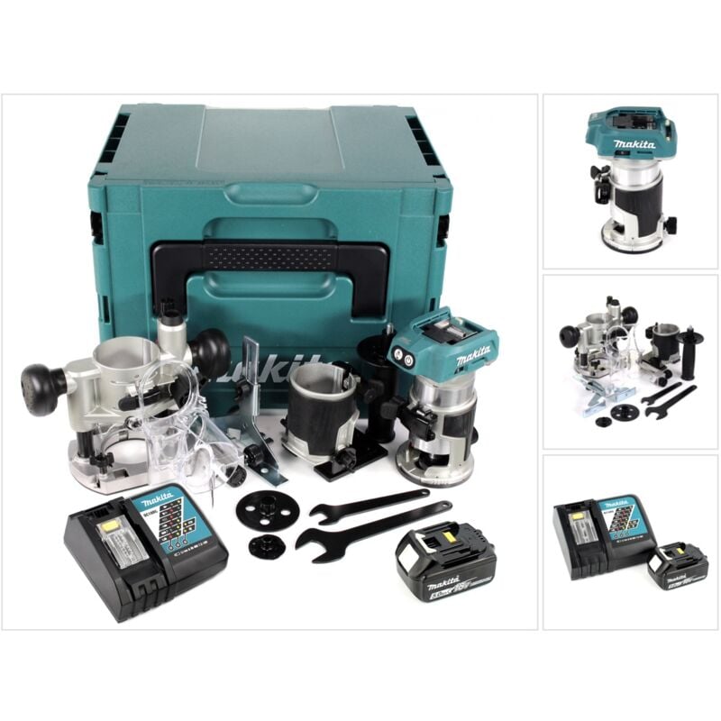 Dotazione: - 1x Makita DRT 50 18 V Fresatrice multifunzione a batteria - 1x Batteria Makita BL 1850 18 V da 5,0 Ah - 5000mAh - 1x Caricatore rapido Makita DC 18 RC 7,2 - 18 V - 1x Modulo di di scavatura - 1x Modulo di rifilatura differita con meccanismo propulsore - 1x Modulo di rifilatura inclinabile - 1x Valigetta Makita MAKPAC 4 - 1x Inserto per Makpac 4 - 1x Guida parallela - 1x Chiave di montaggio 22( 781011A1 ) - 1x Chiave di montaggio 13 ( 7810399 ) - 1x Lastra di guida - 1x Raccordo d'aspirazione Descrizione prodotto: La fresatrice multifunzione a batteria Makita DRT 50 è estremamente versatile grazie al potente motore brushless (senza spazzole) e ai 4 moduli intercambiabili (rifilatura diritta, rifilatura inclinabile, rifilatura angoli e fresatura). La macchina è dotata di una funzione soft start per l'avviamento controllato e progressivo, per un lavoro più preciso e sicuro, e di un variatore di velocità di rotazione che permette di regolare la velocità in funzione del