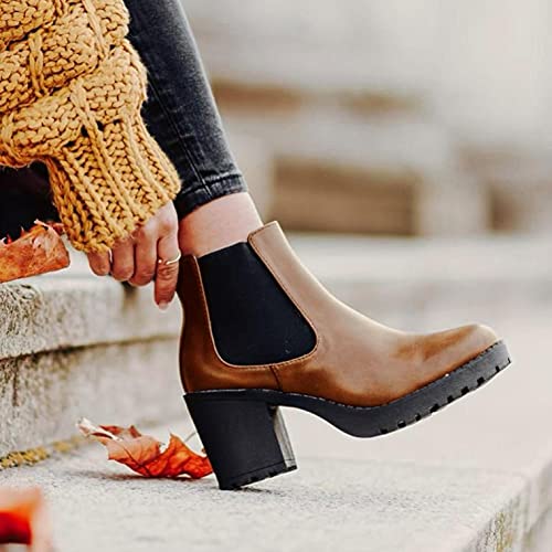 RTPR Stivali corti da donna, tinta unita, con gambo corto, foderati, a mezza gamba, con ricamo quadrato, antiscivolo, da donna, marrone, 37 EU