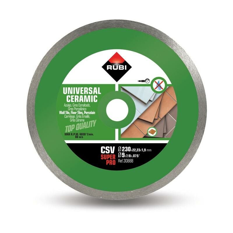 I dischi diamantati a banda continua csv, rubi, sono la migliore opzione di taglio a secco, con smerigliatrice, per il taglio di tutti i tipi di piastrelle in ceramica.i dischi diamantati csv si adattano meglio di qualsiasi altro disco nelle situazioni in cui il professionista deve lavorare con piastelle in ceramiche di diffenti tipologie. l'utilizzo di un disco diamantato universale come il csv, riduce le perdite di tempo generate dal cambio di disco nel momento in cui si cambia il materiale da tagliare. allo stesso tempo otterremo una qualità di taglio e un rendimento ottimo in tutti i materiali.la combinazione tra il grano di diamante e la lega, rende il disco diamantato csv, rubi, perfetto per il taglio universale di piastrelle in ceramica come bicottura, gres, gres porcellanato.il disco diamantato csv, rubi, è un disco a banda continua. questa tipologia di dischi diamantati offrono al professionista della posa di ceramiche la possibilità di ottenere finiture di alta qualità.il