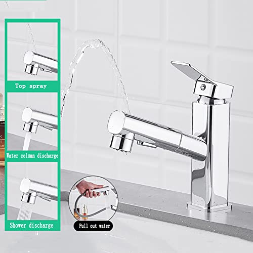 Multifunzionale: il beccuccio estraibile è comodo per lavare i capelli nel lavabo, il beccuccio superiore è comodo per lavarsi i denti e lavarsi il viso e il pratico rubinetto del lavandino a barra singola può facilmente scambiare caldo e freddo acqua e regolare la temperatura come preferisci.