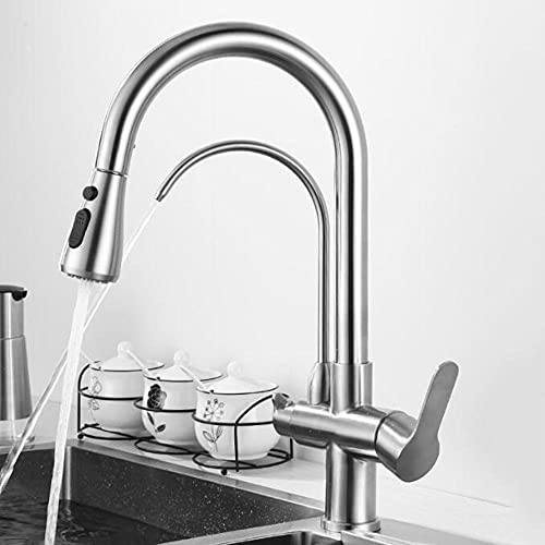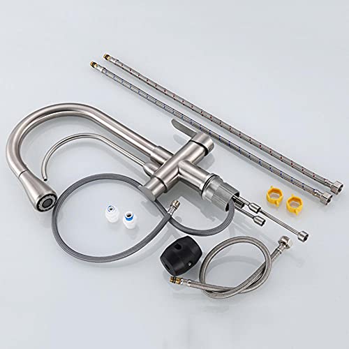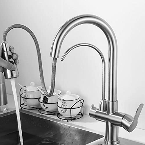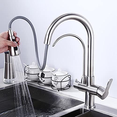 Rubinetto 3 Vie Cucina con Doccetta Estraibile Acciaio Inossidabile Spazzolato Acqua Fredda e Calda Acqua Pura 3 in 1.360 ° Girevole Miscelatore Cucina
