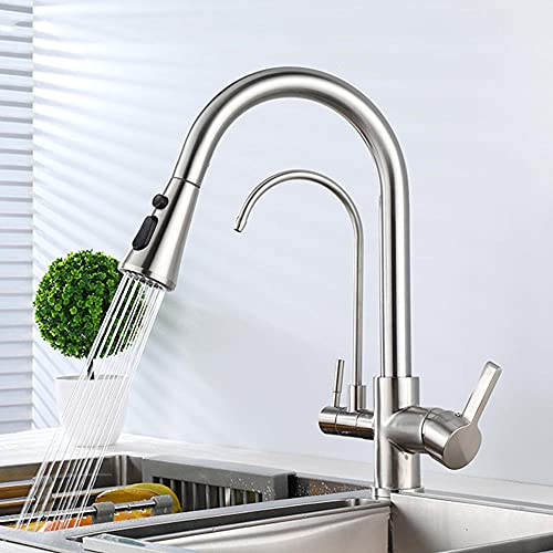 Rubinetto 3 Vie Cucina con Doccetta Estraibile Ottone Spazzolato Acqua Fredda e Calda Bevanda Dritta Girevole A 360 ° Multi-Funzione Miscelatore Cucina-C.