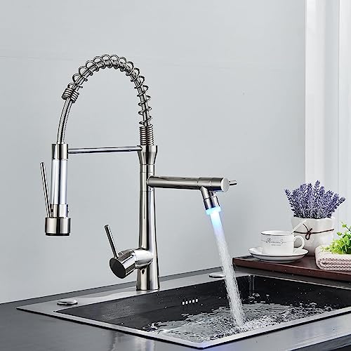 Rubinetto Cucina LED, Miscelatore Cucina Con Doccetta Estraibile,Rotazione Di 360 Rubinetto Lavello Cucina,Nichel Spazzolato