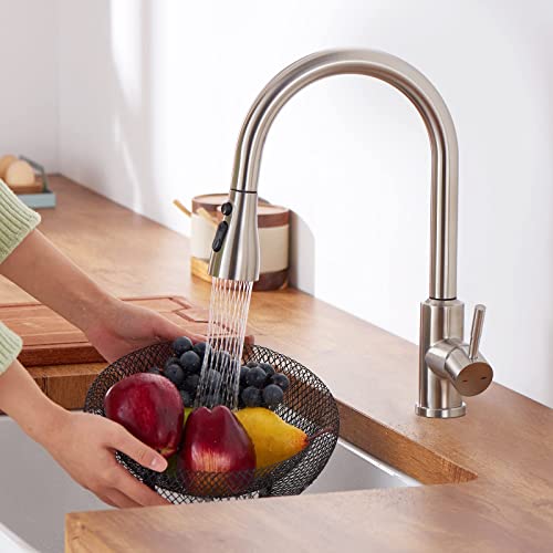 Rubinetto Cucina con Doccetta Estraibile: facile controllo della temperatura e del flusso dell'acqua con un'unica maniglia. L'ugello a collo d'oca ad arco da 15 "di altezza, l'ugello girevole a 360 gradi e il tubo di spruzzatura a discesa da 24" offrono un ampio accesso per la pulizia.
