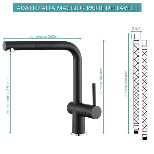 √【Materiale di alta qualità】 Rubinetto lavello cucina in acciaio inox 304, resistente alla ruggine e alla corrosione, forte e durevole. La superficie è galvanizzata in nero opaco, efficace contro le impronte digitali e facile da pulire. Nucleo valvola in ceramica con buone prestazioni di tenuta, efficacemente a prova di perdite, dopo molti test di usura, la durata può raggiungere 500.000 volte.
