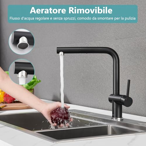 √【Esperienza d'acqua confortevole】 Il miscelatore cucina con doccetta estraibile adotta un aeratore di alta qualità, un flusso d'acqua dolce senza schizzi, comodo al tatto, con un risparmio d'acqua fino al 30%, economico e pratico. L'aeratore è rimovibile e può essere pulito regolarmente per evitare intasamenti. (Nota bene: questo rubinetto da cucina nero non può essere commutato tra le modalità di getto d'acqua! Nessuna modalità doccia!).