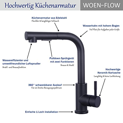 Rubinetto Lavello Cucina Nero, Woen-Flow L Form Miscelatore Cucina Girevole a 360° con Doccetta Estraibile, Rubinetti Lavello Cucina con Uscita Acqua a 2 Funzioni, 304 Acciaio Inox