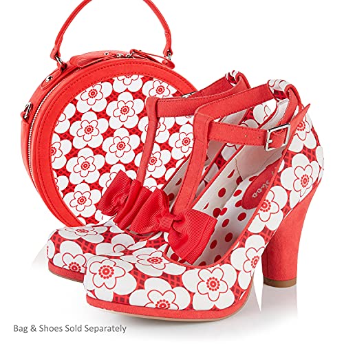 Soletta comfort Indulgence - T-bar KIARA sul nostro classico tacco rotondo presenta una piattaforma sottile, un taglio elegante e un grazioso fiocco. In una splendida stampa floreale geometrica abbinata a una fodera a pois e grazioso fiocco rosso, Ruby Shoo KIARA si abbina perfettamente allo stile della borsa ALBERTA