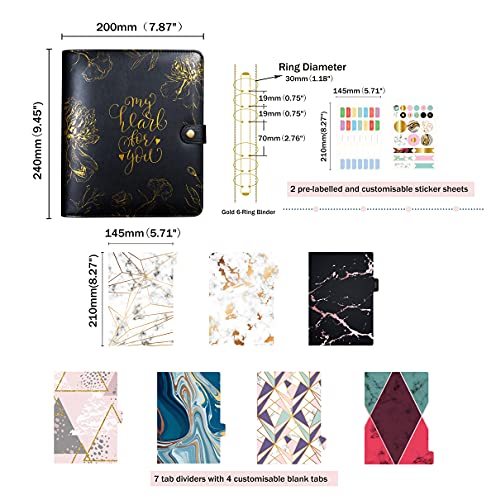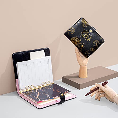 ➤. DISPOSIZIONE INTERNA - Chiusura con bottone a bottone in metallo, tre slot per carte, uno slot per mini blocco note, 2 tasche semiaperte e una tasca con zip di segreteria a sinistra, puoi mettere carte bancarie, carte d'identità, carte VIP, biglietti aerei, ecc. Una penna supporto e uno slot per blocco note sul lato destro. Raccoglitore in oro a 6 anelli, il diametro dell'anello è di circa 30 mm (1,18"), 18 mm (0,71") tra ciascun anello, distanza centrale di 70 mm (2,76")